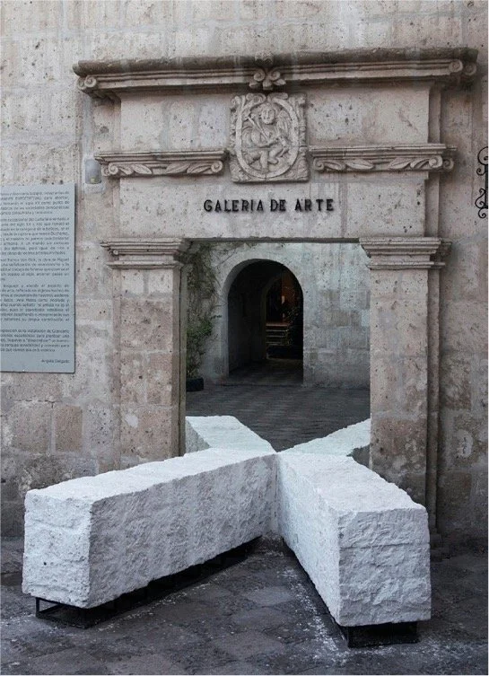 MONUMENTO XX NO 4 is an installation from 2014 with two steel plates, each 3.05m x 1.22m, and a light projector. Fantasmas was made in 2011 and consists of three panels of stainless steel with architectural drawings scratched into them. MONUMENTO XX, 2007, is a site specic installation made of volcanic rock at Centro Cultural Peruano-Norteamericano, Arequipa, Peru, in 2007. Photography: José Carlos Martinat.